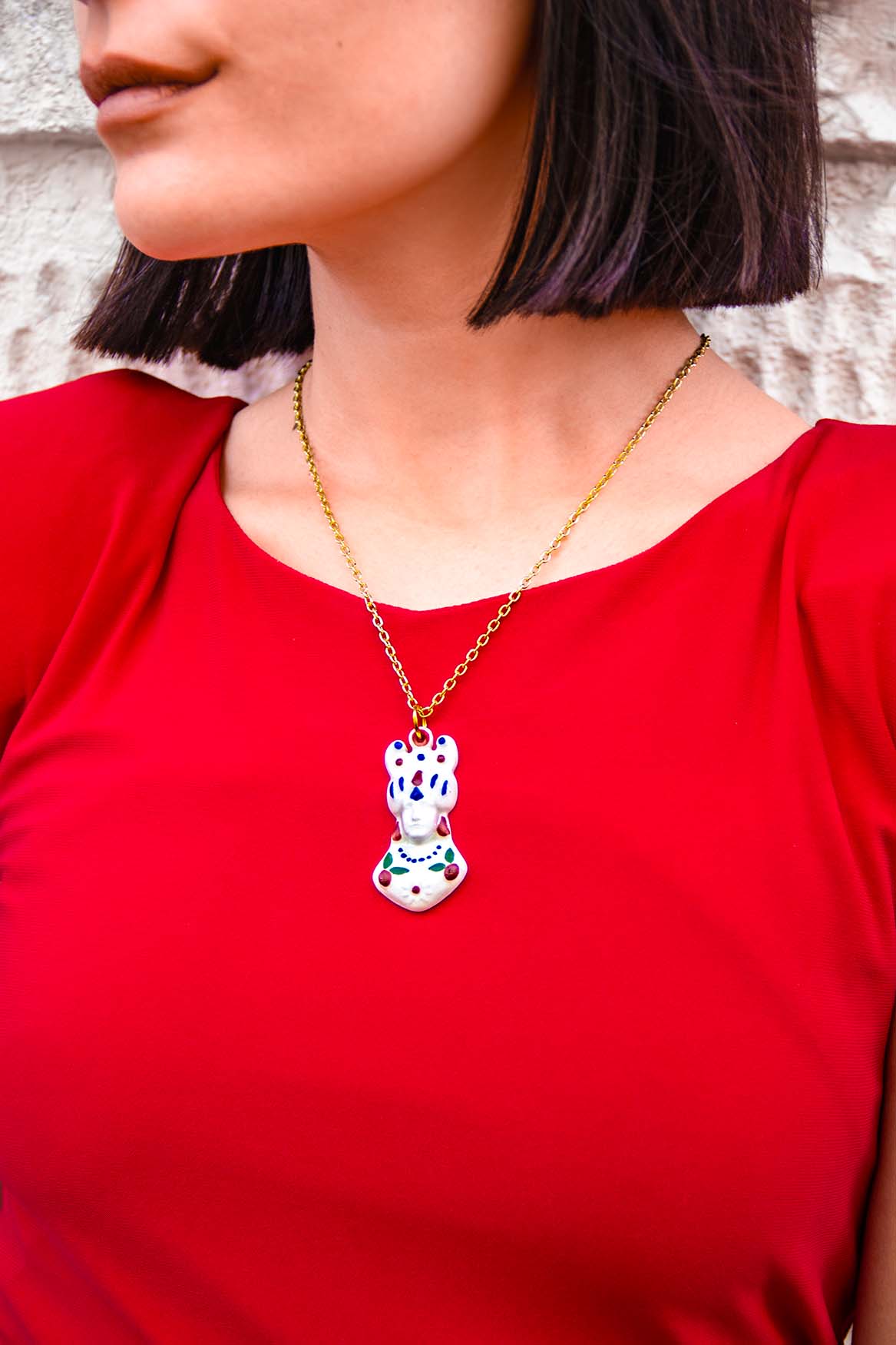 Inspirado en el origen andalusí de Madrid y en las icónicas cabezas sicilianas de Caltagirone, este collar artesanal celebra el enriquecedor valor del intercambio cultural entre civilizaciones. Cuando las culturas dialogan pacíficamente, surgen maravillas. Su diseño exclusivo evoca el perímetro de la primera muralla de Madrid y detalles florales del arte islámico, simbolizando convivencia y respeto.