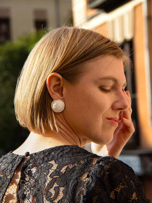 Estes brincos de botão têm uma textura tridimensional única que cria um efeito de brilho natural ao brincar com a luz e as sombras. Escolha algo versátil, elegante e ideal para qualquer ocasião
